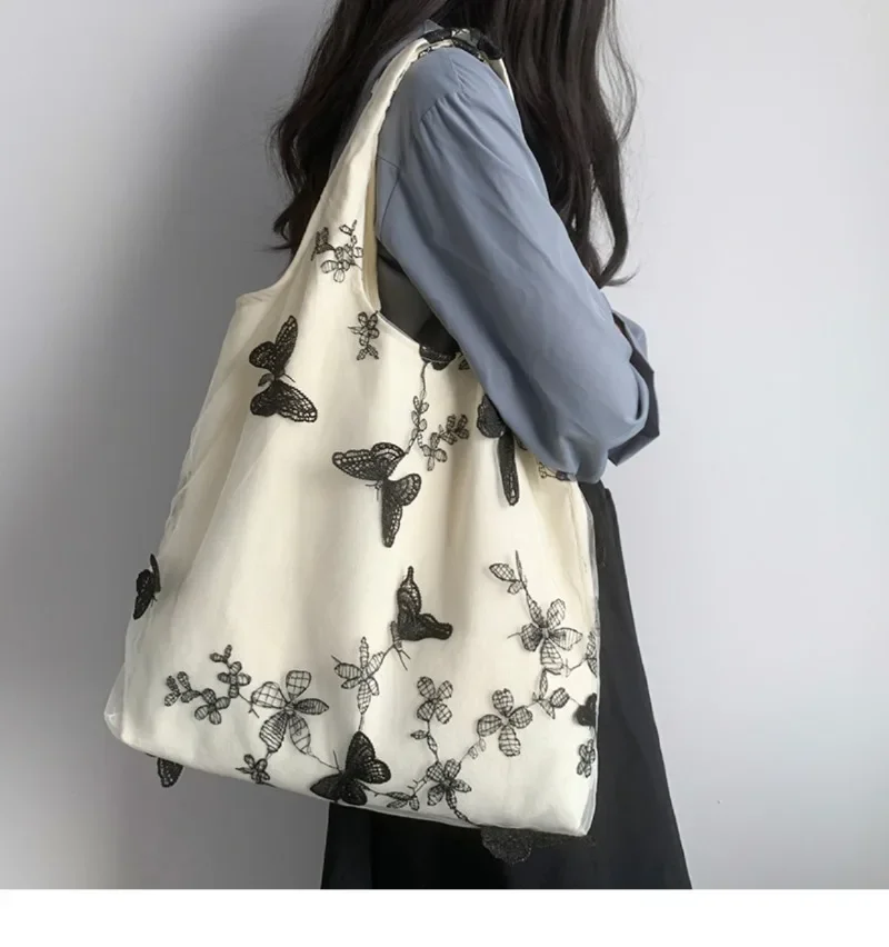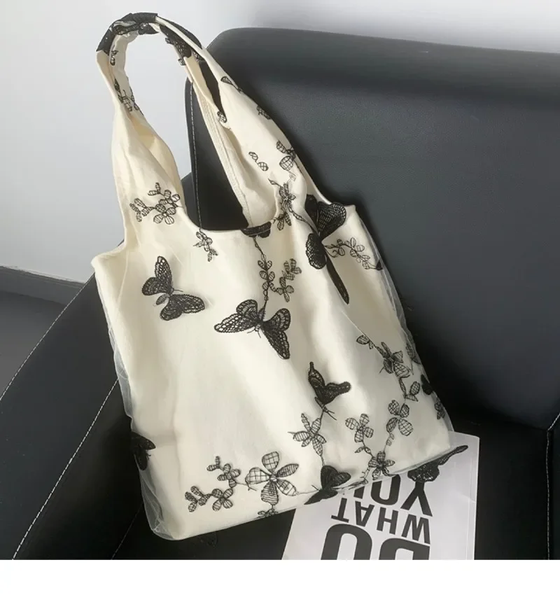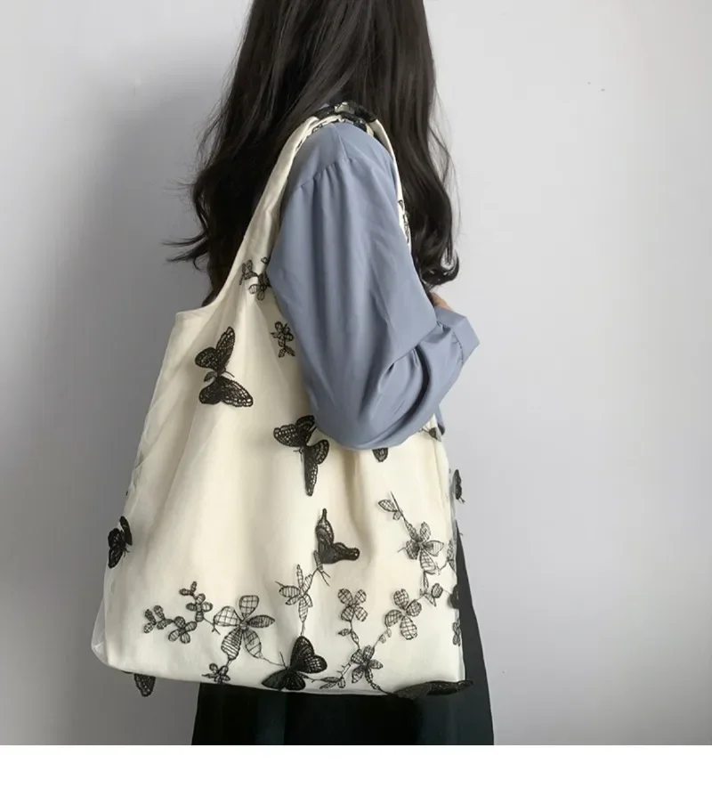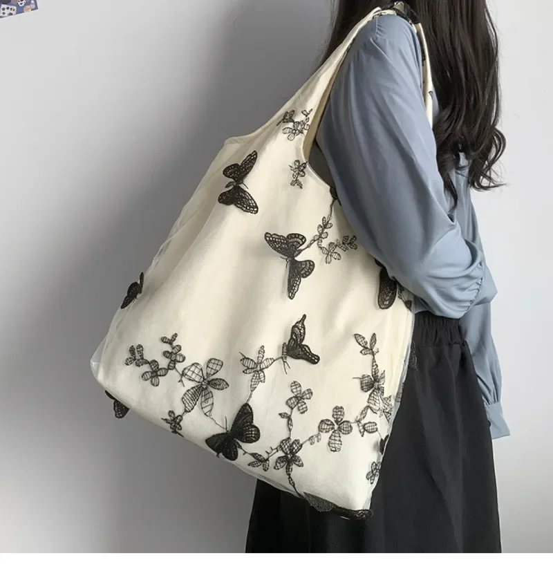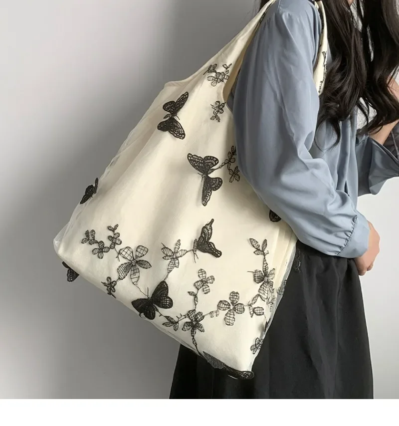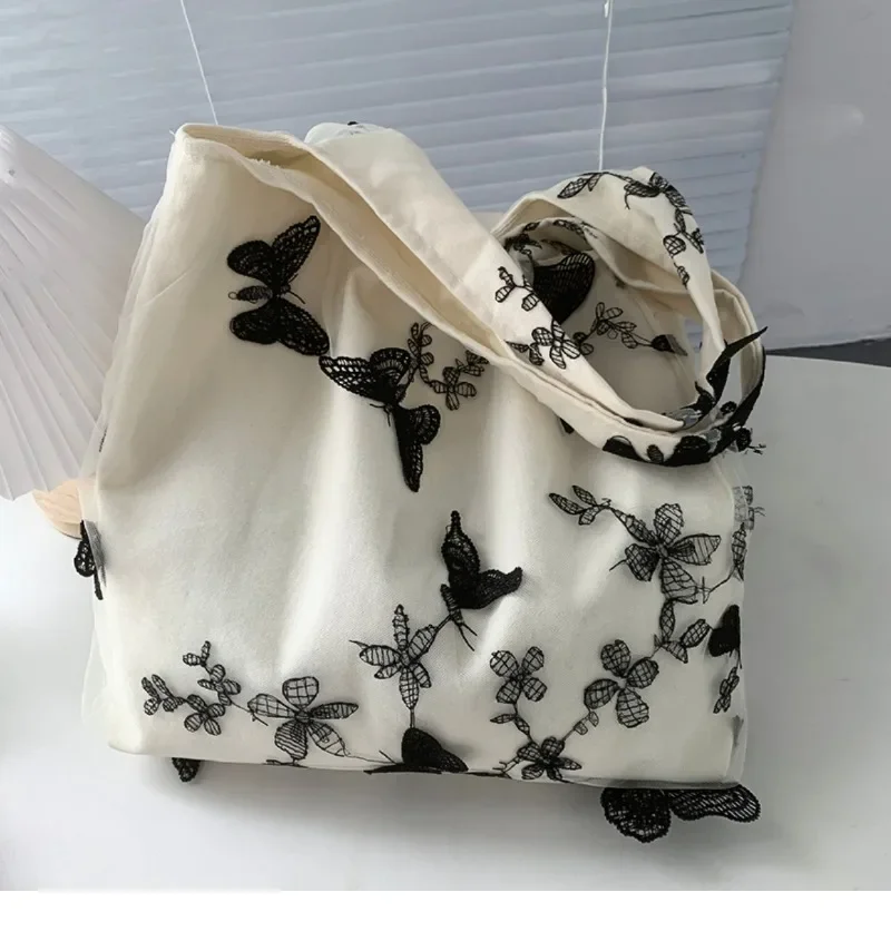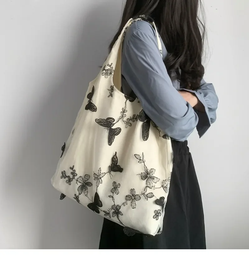 超美刺绣蝴蝶蕾丝仙女袋ins出行女包帆布包文艺大容量百搭单肩包